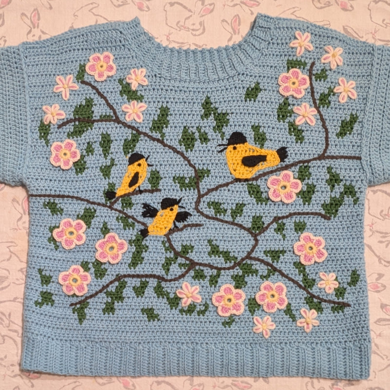 Tapestry crochet & surface decoration | Maud Lewis Yellow Birds sweater